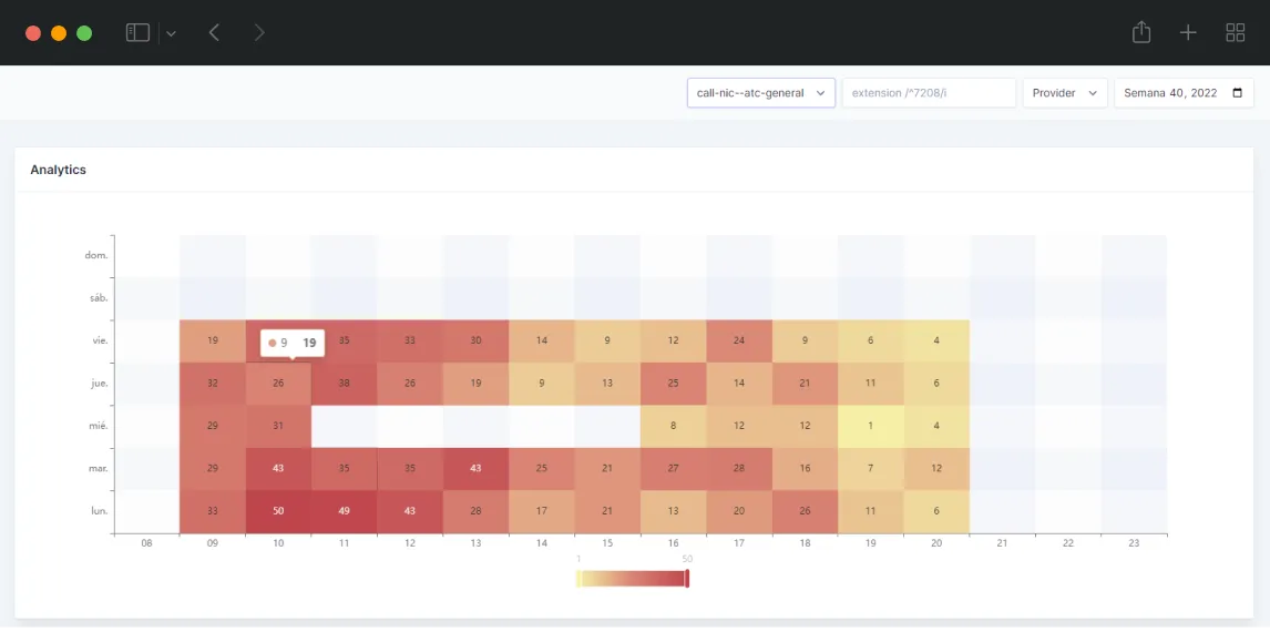 Mapas de calor para parametrizar el volumen de llamadas según día y hora de la semana con el fin de optimizar los recursos.