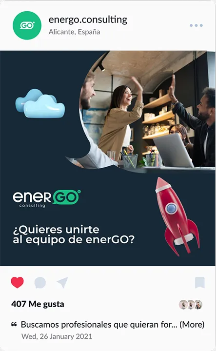 Para gustos, las redes sociales. Tu perfil de Instagram, LinkedIn o Facebook marca la diferencia a la hora de llegar a tu público objetivo. Nos aseguramos de crear y adaptar el contenido de enerGO Consulting al público de cada red social con el fin de alcanzar el target de la marca.